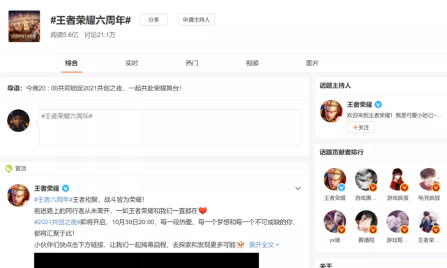 而在宣发的过程中,如何做话题,如何做热点,如何与大V建联,如何与玩家沟通,微博都会进行引导。《王者荣耀》周年庆、官宣新代言人以及限定皮肤上线,上述重要的节点开发商都会和微博进行沟通。通过后台数据,微博给予制作组合理化建议,最终实现了每次举办重要的活动,《王者荣耀》都会上热搜。