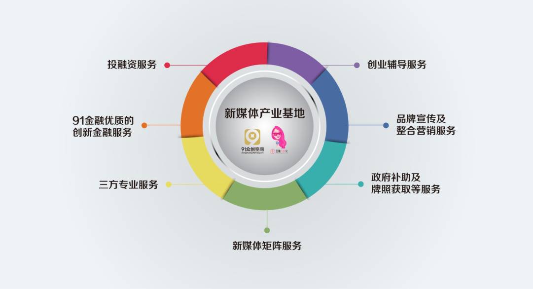 1、投融资服务。一方面,新媒体产业基地有效整合91金融、金八传媒在投融资方面的经验及资源,帮助入驻的新媒体创业企业引荐投资机构;另一方面,91金融旗下投融资业务91资本将优先关注并投资基地内优质的创业企业。