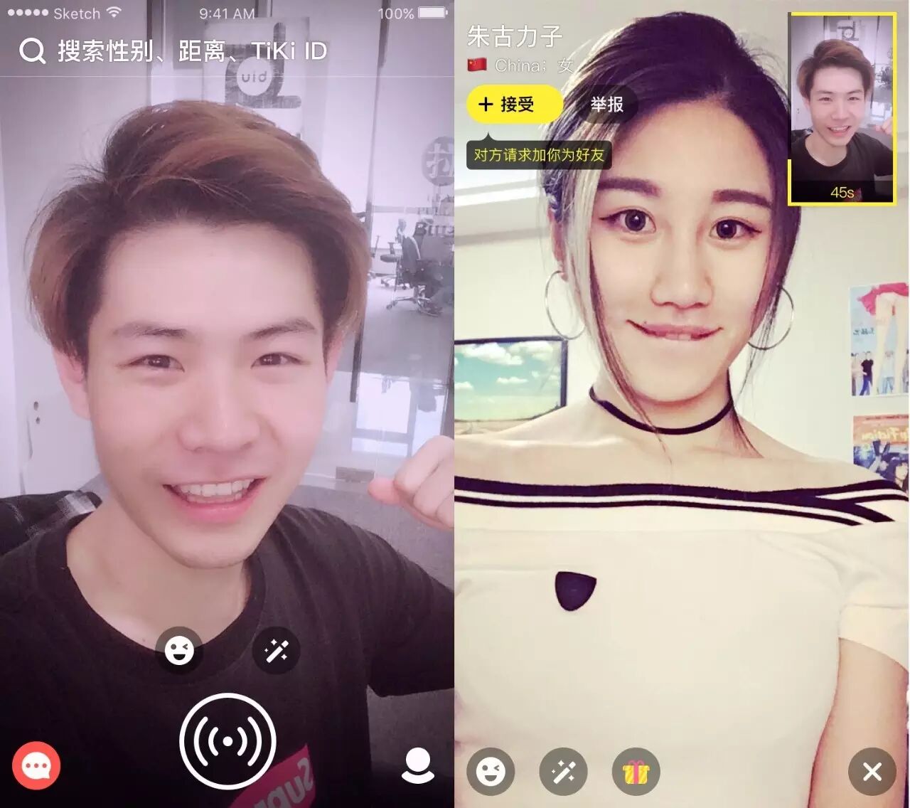 打开“Tiki”app,手机前置摄像头也随即开启,你马上就可以和全世界的陌生人视频聊天了。