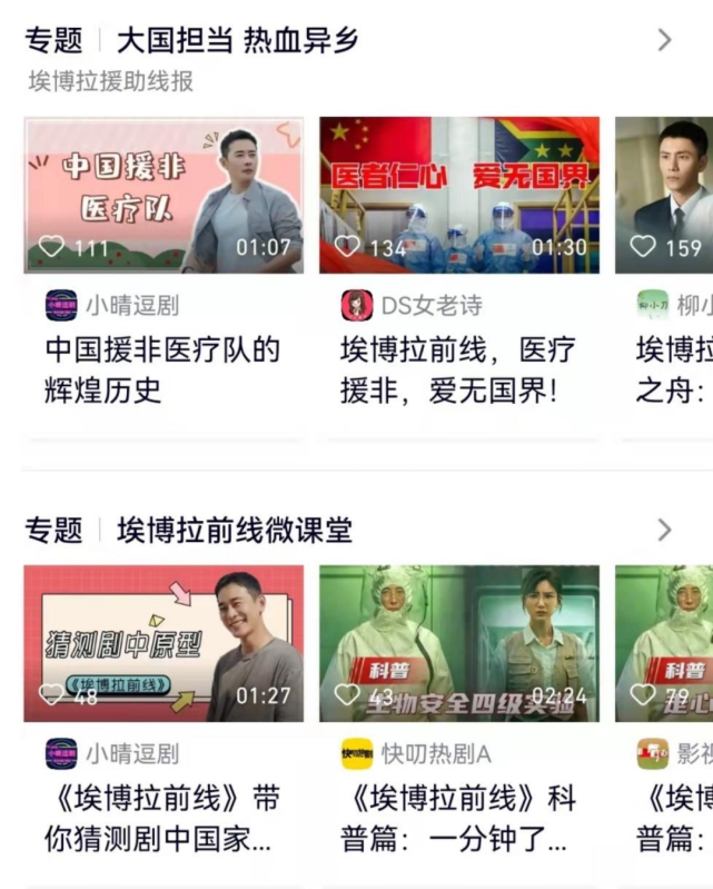 站在这一层面上,腾讯视频为了更好地向观众科普历史,在《埃博拉前线》播放页面,设置了多个专题:“大国担当热血异乡”的埃博拉援助线报,“埃博拉前线微课堂”的科普视频等等,以平台力量帮助优质主旋律剧传播正向价值。