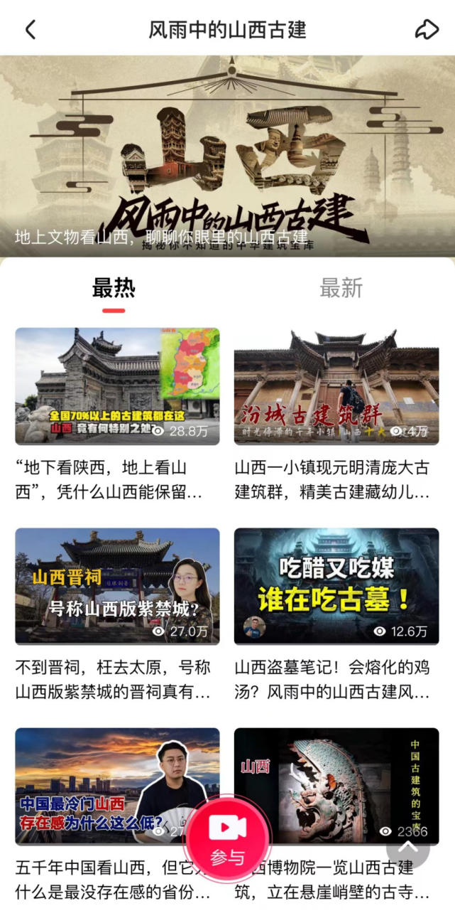 今年10月,山西境内古建筑文物因暴雨受灾情,好看视频上线了“风雨中的山西古建”视频专区,从山西古建筑的历史、保护、结构、修缮等多个角度,全方位为网友解答山西古建筑受损情况。
