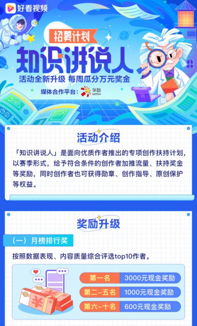 B站在今年上线了知识分区,提供百万奖金和上亿流量扶持;抖音的“萌知”计划,为面向青少年生产知识内容的创作者,提供百亿流量扶持;好看视频去年就拿出1000亿流量和10亿元来扶持泛知识创作者,今年又推出了优质创作者榜单,对创作者进行万元现金激励和流量扶持。