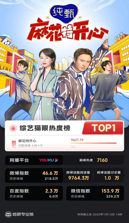 据灯塔专业版,《麻花特开心》上线首日及上周日第二期播出时,分别以22.5%和18.93%的市占率登顶,期间微博好评率达99%,在多个平台也占据了TOP1的位置。