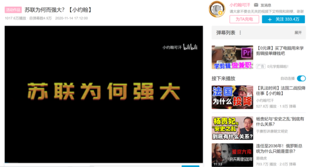 一个月之后,《苏联为何而强大》成为全站爆款,点击量突破千万。自此之后,小约翰可汗的视频播放量就一直维持在了400万以上的平均水平。去年7月,小约翰可汗的B站粉丝数突破百万,足见破圈速度之快。