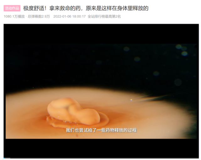 比如从百大UP主“影视飓风”中拆分出来的“亿点点不一样”,通过与四川大学华西药学院的沟通学习,在高速摄影机的镜头下,详细展示了不同种类的药丸是如何在服用之后释放,并作用于人体的。这段视频在B站获得了1067万的播放量,也是“亿点点不一样”建号以来的播放量最高纪录。