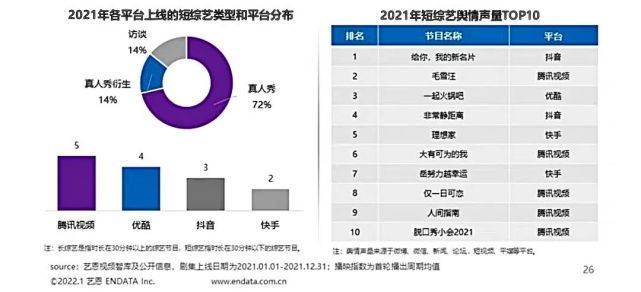 从格局来看,过去一年,抖音、快手、B站等综艺领域新玩家入局作品众多,在垂类创新上有所突破。但从平台产能、播放量和用户好评度来看,腾讯视频、爱奇艺、芒果、优酷构成的第一梯队优势明显,新势力并未出现。