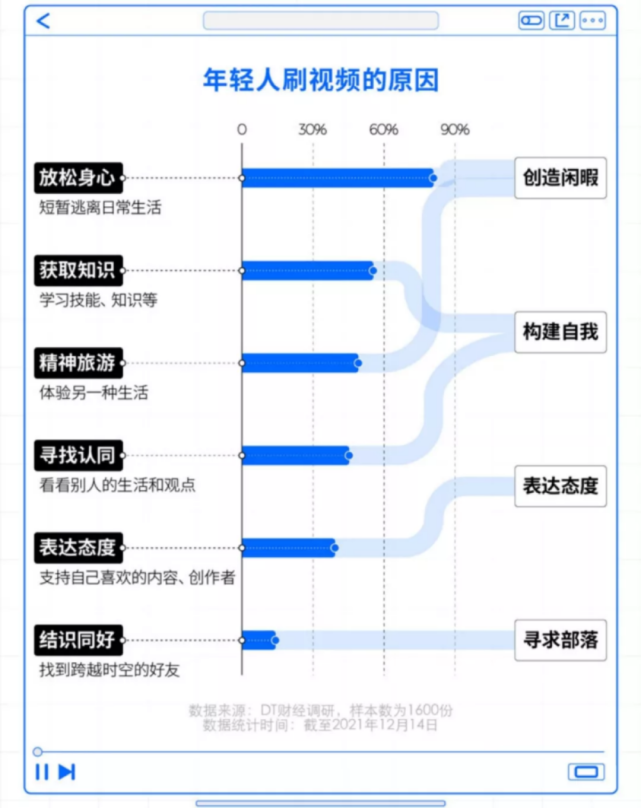 这也与当代年轻用户对视频内容的需求变化息息相关。2021年年末,腾讯视频联合DT财经、第一财经商业数据中心发布的腾讯视频年度报告显示,1600名接受调研的年轻人中,有超过5成受众希望可以借助视频获取知识、满足精神需求。此外,表达态度、寻求部落也是年轻人希望借助视频所实现的。