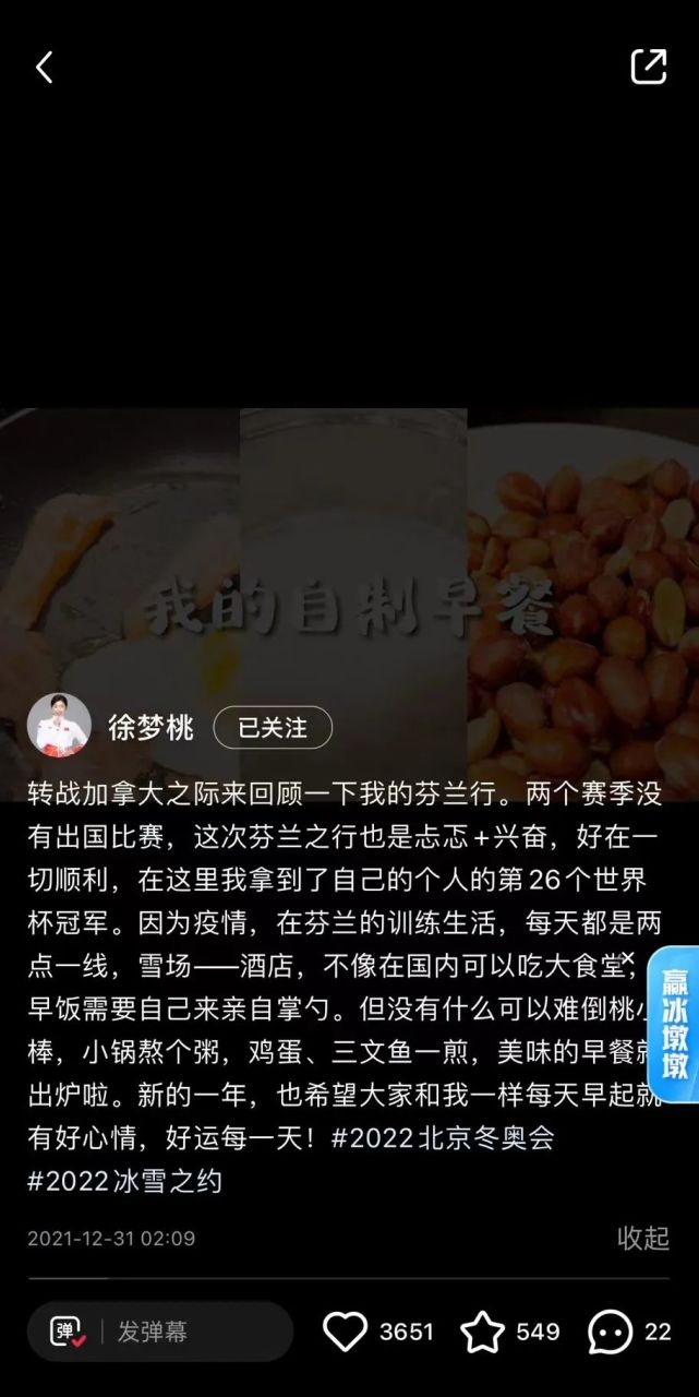 在小红书里,她记录了自己在芬兰备战冬奥时的自制早餐,也分享了在9天比赛中拿下3金1银1铜的好成绩。