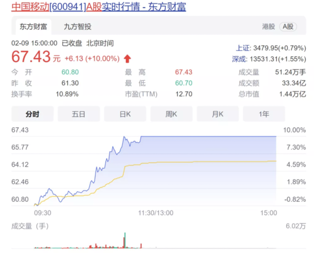这次冬奥会让咪咕视频尝到了巨大流量的甜头。冬奥会期间,咪咕视频大步流行向头部平台迈进,飙升到Apple Store下载榜第二名。咪咕也开始反哺背后的中国移动,直接影响其股价。截至2月9日收盘,中国移动股价直接涨停,报收67.43元,总市值1.44万亿元,位居A股第四位。