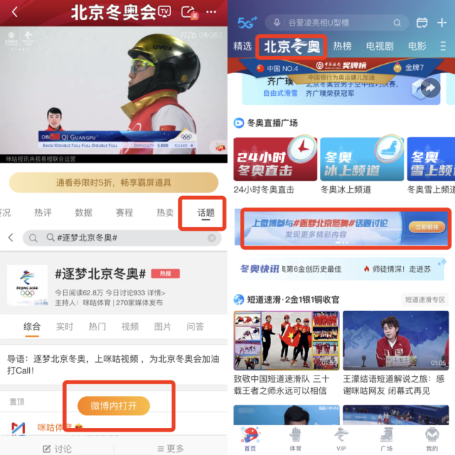 今年冬奥会,双方对产品再次进行优化、升级打通以及人性化表达。比如,在咪咕APP端内,比赛直播、回放视频下方的话题栏下,既有微博热搜页的展示,也能直接跳转到微博,对实时话题进行讨论;咪咕首页北京冬奥播放栏下的横幅广告,也有前往微博讨论的触点,一旦有需求,就能立即找到跳转入口。