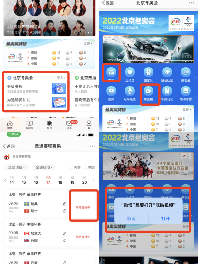 在微博端内,发现页有显著的#北京冬奥会#专题栏,进入之后,一是点击赛程,凡是有直播的都会跳转到咪咕直播;二是点击看直播,也会显示跳转咪咕视频。