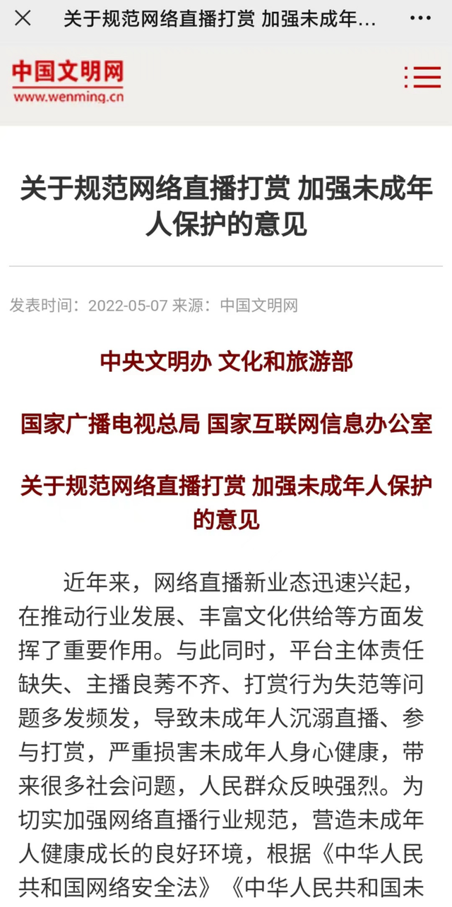 昨日,四部委联合发布了《关于规范网络直播打赏 加强未成年人保护的意见》,其中规定,网络平台应在本意见发布1个月内全部取消打赏榜单,禁止以打赏额度为唯一依据对网络主播排名、引流、推荐,禁止以打赏额度为标准对用户进行排名。