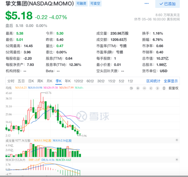 此外,陌陌也尝试多种方式的转型,不过一直没能转型成功。目前,公司账面上尽管趴着几十亿现金,但由于公司业务缺乏未来想象力,目前股价已经跌至低点,雪球评价可卖空。甚至有股民在雪球上调侃陌陌,可能是下一个趣头条。
