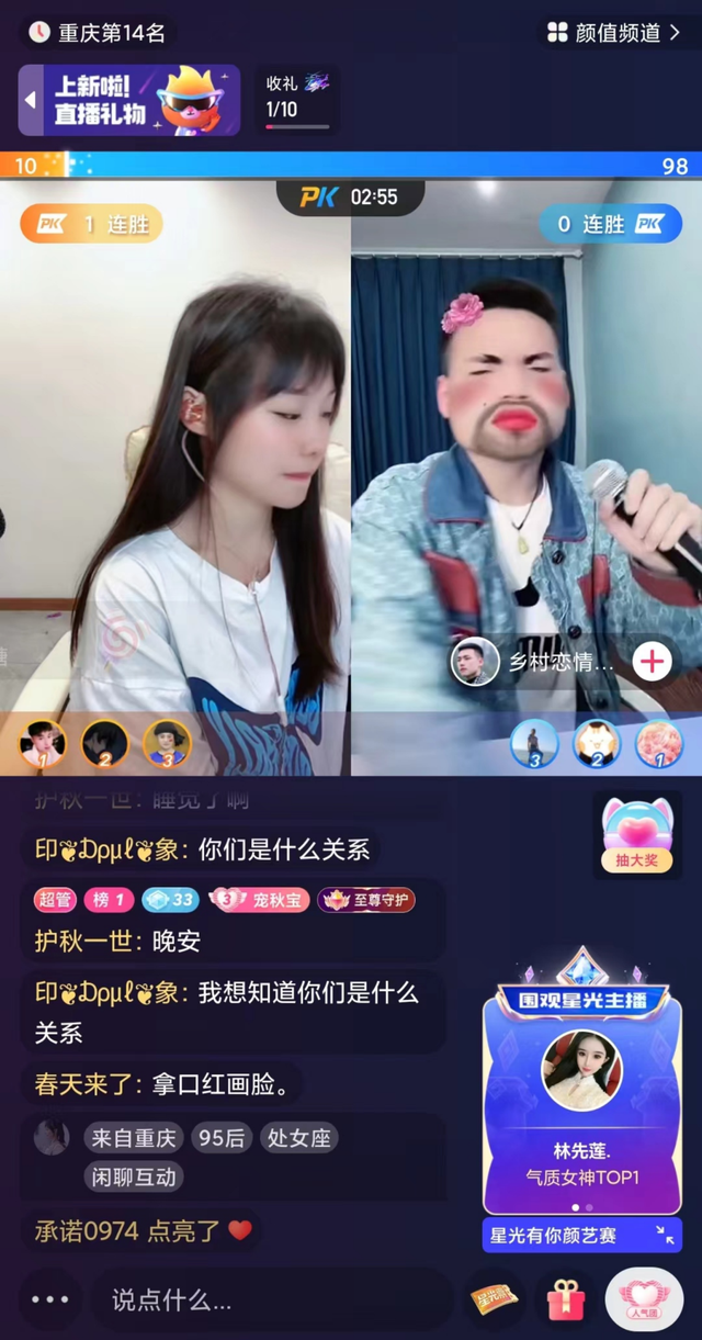 黄金时段是直播间人气最高的时候,主播们会通过连麦PK的方式,以吸引更多的新粉丝关注,而PK期间的“奇葩赌约”往往能将直播间的气氛烘托到极点。