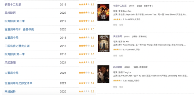 但与此同时,细数这些影视改编作品的过往表现,剧集方面,除《长安十二时辰》评分突破8分、观看人数达到了44万人以外,《风起陇西》评分在7.9分,其他作品的评分大多都在6.5分左右徘徊,热度也远不及《庆余年》等爆款IP改编剧集。