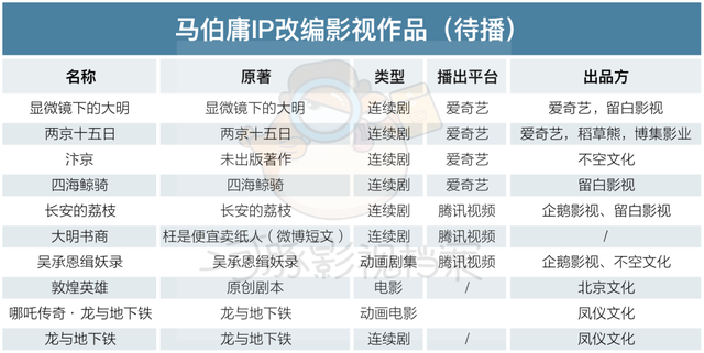 据不完全统计,包括《风起陇西》在内,由马伯庸原著小说直接改编而来的影视作品共有11部,自2018年开始保持着每年2-3部的稳定输出,10部待播项目也处于不同制作阶段,是各个平台强势IP储备的重要来源。