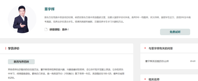 点开网页上学生们对他的评价可以看到,“其他老师也许教你的仅仅是方法,董宇辉老师培养的是兴趣,兴趣是最好的老师,会让你不知不觉爱上英语。”“董宇辉老师算是我在高中阶段见过唯一一个那么相信我们都能考上985的老师。”