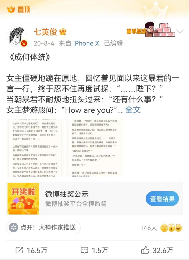 很多新生代作者也正是借助这样的方法,一步步收获泛兴趣读者,获得更广谱的粉丝基础,完成了冷启动。典型例如七英俊,正是借助在微博连载的《有药》,一步步收获读者,逐渐成长为大神。