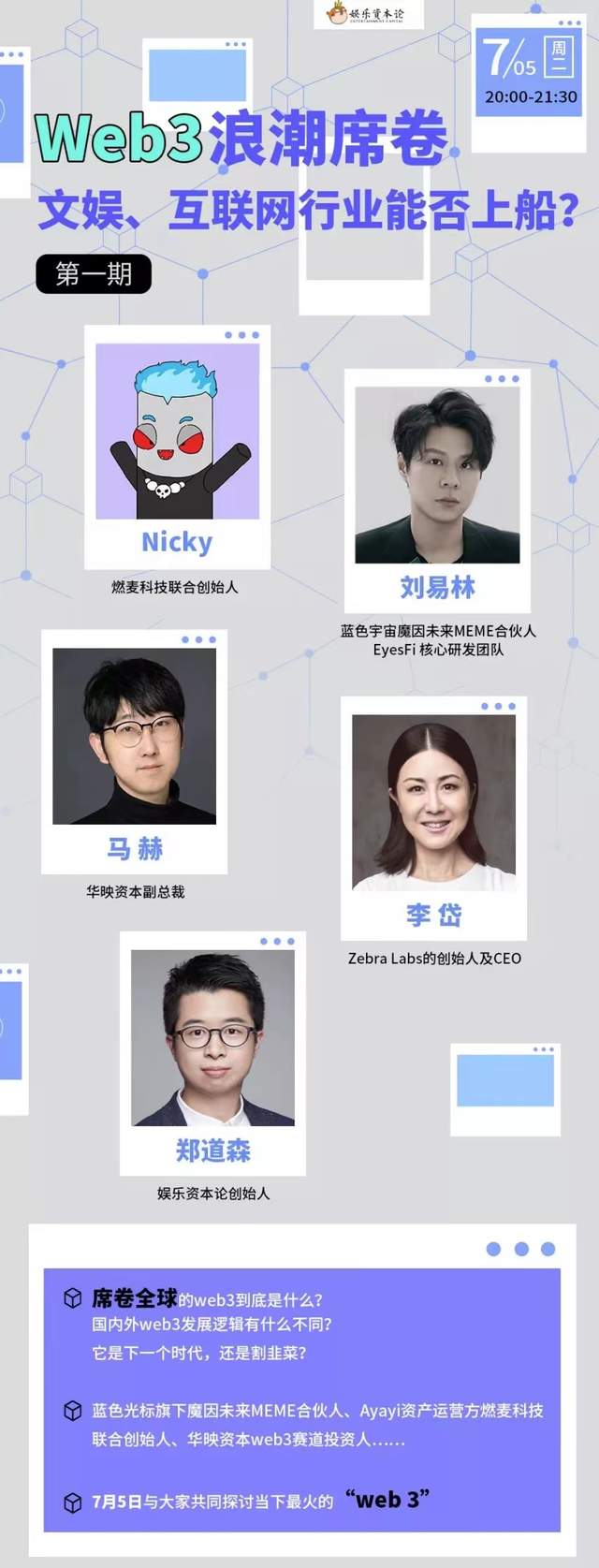 在这样一个微妙的时机,我们请到了蓝色宇宙魔因未来MEME合伙人、EyesFi 核心研发团队 刘易林,Zebra Labs的创始人及CEO 李岱,燃麦科技联合创始人Nicky和华映资本副总裁马赫,来共同探讨web 3浪潮席卷,文娱、互联网行业能否在此时上船?