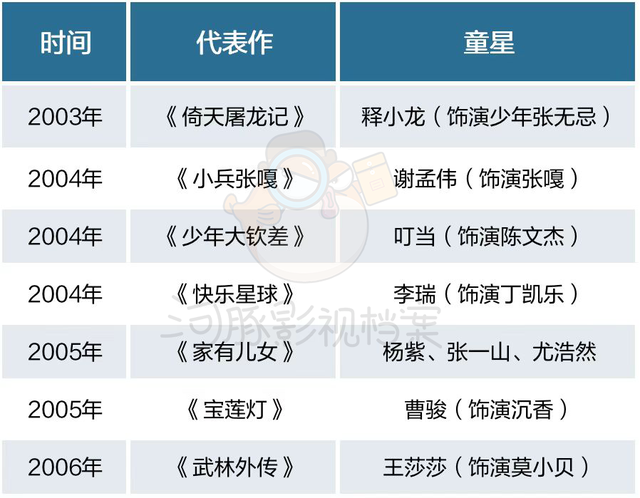2003年到2006年的国产剧盛产童星,他们在剧中承担着重要的角色任务,往往表演到位、感情丰富,是当下老剧怀旧风潮中的重要组成。《小兵张嘎》《少年大钦差》《宝莲灯》《家有儿女》等多部经典电视剧均产出了大批的国民童星,比如杨紫、张一山,其中释小龙作为最家喻户晓的童星,早在90年代就拍了大量的戏,深受观众喜爱。