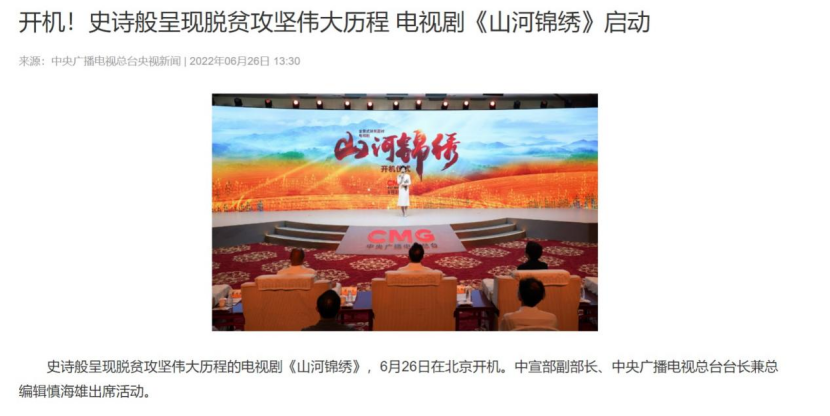 6月备案中的由中央广播电视总台制作的电视剧《山河锦绣》讲述我国西部山区两代人,在中国共产党领导下脱贫的故事,呈现脱贫攻坚的伟大历程。该剧已于6月26日在北京开机,为中央广播总台重点推介剧目。