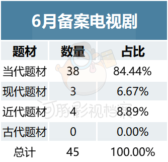 在题材方面,6月电视剧备案中当代题材占比最高,较5月的24部回升至38部,增加了青少年题材,现代与近代题材都有所下降,从5部和7部下降至3部和4部。除此之外,古代题材并未在6月电视剧备案中出现。