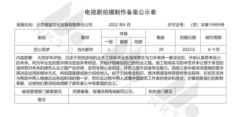 从6月电视剧备案可以看出,主旋律电视剧也在致力于破题,不仅限于脱贫攻坚、乡村振兴题材。其中电视剧《匠心筑梦》讲述了建筑从业者洛榟霖在毕业后决定创业,在西部之旅中被我国的基建成就震撼,运用新媒体方式将祖国基建成就介绍给世人,从中明白了中国建筑从业者的使命和责任。