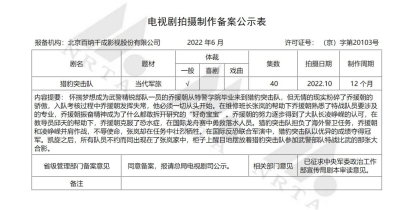 自《特战荣耀》热播后,6月又一部军旅题材电视剧备案。电视剧《猎豹突击队》讲述了怀揣梦想成为武警精锐部队一员的乔援朝从特警学院毕业来到猎豹突击队,在维修班长张岚、教导员邱天等人的帮助下成为了猎豹突击队的一员,担负海外警卫任务,参加国际反恐联合军演等活动,展现了猎豹突击队过硬的实力。值得关注的是,《特战荣耀》中由杨洋饰演的燕破岳一角同样是在名为“猎豹突击队”的武警特战队下的一名特战队员。