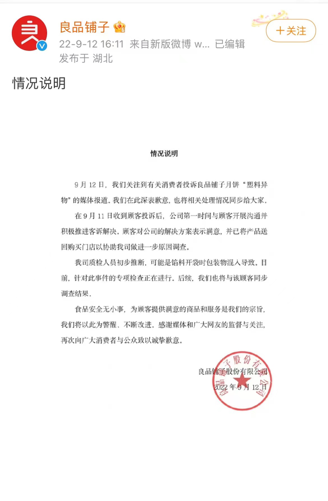 最近,一位消费者晒出的“塑料月饼”直接把良品铺子带上了热搜。据了解,该顾客在外卖平台上买了良品铺子的月饼,刚吃第一口就发现了馅里的塑料纸。随后良品铺子道歉解释道:可能是月饼馅料开袋时的包装被混入了,目前正在进行进一步的调查。