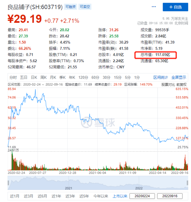 2020年,良品铺子头顶高端零食第一股的光环成功上市,巅峰时其市值一度达到350亿,现在只有112.08亿,看来其高端化的发展策略,并没有让资本市场买账。截止目前,良品铺子的市值已经缩水了32%。