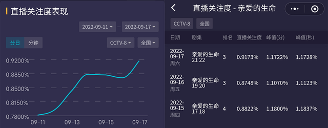 除了视频平台的供应之外,电视台播出的剧集也明显在年轻化、精致化。比如与爱奇艺在去年达成深度合作的央视八套,本月又有一轮电视剧上新,这次登陆央八黄金档的是由宋茜担纲的都市医疗情感剧《亲爱的生命》,开播一周后酷云收视每日攀升,如今已经实现连续单集峰值破1,爱奇艺站内热度破6000,算得上是得到了电视观众与网络观众的双双认可。