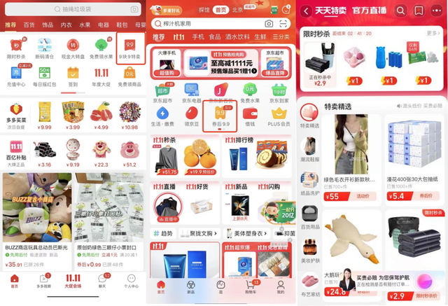 上文提到的话术就源自微信视频号的直播间,除此之外,拼多多的“9块9特卖”、京东的“券后9.9”和抖音极速版的9块9特价频道都很相似,淘宝的天天特卖和9块9包邮的模式也大同小异。