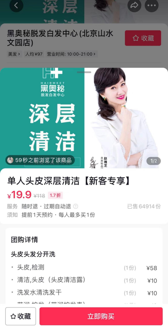 新用户只需要19.9元,就可以在线下门店实现一次头皮检测、头皮头发分开洗,用户到店之后,通过体验门店的服务,会进一步升级套餐,同时,对于了解品牌的老用户,也可以直接在直播间购买3800元的折扣套餐。