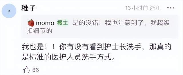 所以在播出后收获的反馈中,得到了很多医护工作者对专业细节体现的肯定,比如护士长的日常洗手方式是标准医护人员才会做的,剧中所有医生在每一次的医疗动作后都会自然而然地用随处可见的消毒洗手液进行手部消毒,这就是医生将消毒动作形成肌肉记忆的细节。