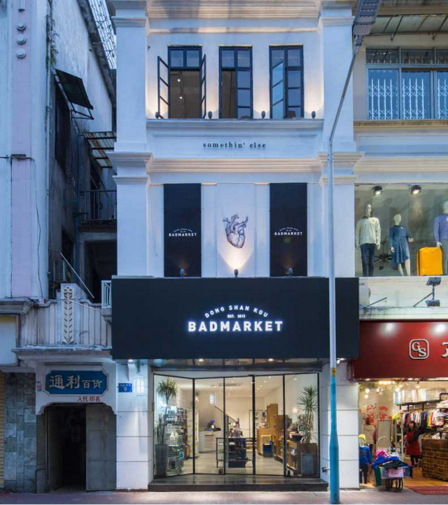2016年,Badmarket是东山口第一家为年轻人、潮人开设的店铺,但卖衣服并不是它的主业,其周围也更多是服务于当地居民的生活小店。在过去的一些媒体报道中,它更多地被称为“走潮流路线的文创店”,一楼主要陈列海外品牌的文具、文创产品,二楼销售服装,三楼则是咖啡店,生活和日常属性让其融入了当时尚未被潮流席卷的东山口。