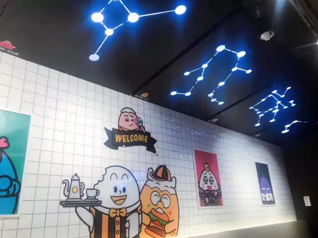 墙壁上画着不同的卡通戏形象,天花板上有12星座的星宿图,有独立区隔开的茶饮空间,咖啡馆的独立一角还有很多星座公仔在卖。