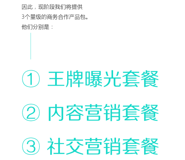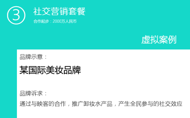 利用直播平台的互动性,映客整合打包资源,推出了三个量级的商务合作产品包,分别是600万起价的王牌曝光套餐、1000万起价的内容营销套餐和2000万起价的社交营销套餐。