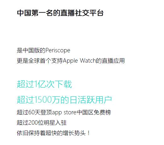 映客直播的公开数据显示,目前映客直播的下载量已超过一亿次,日活量超过1500万,这一数字也在映客商业计划书中有所体现。“这么大的流量为什么不商业化呢”,映客的一位投资人称。