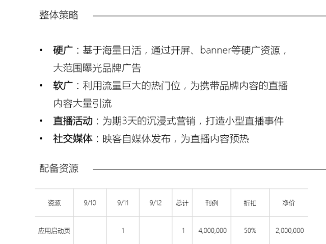 首先,三个量级的产品包最基本的区别在于营销时长不同:王牌曝光套餐的时间最短,为期3天,价格也最便宜。硬广投放的广告位包括了开屏和直播banner,软广则是利用流量巨大的热门位,为携带品牌内容的直播做推广。相比之下,打造直播活动是该套餐内最亮眼的部分:为期三天的小型直播事件引网络话题,辅之以映客直播微信微博的连续推广预热。